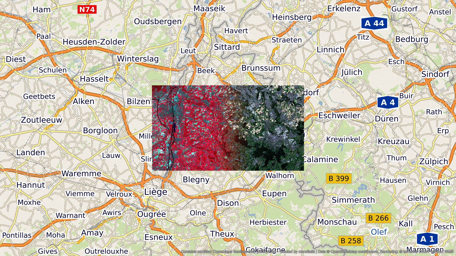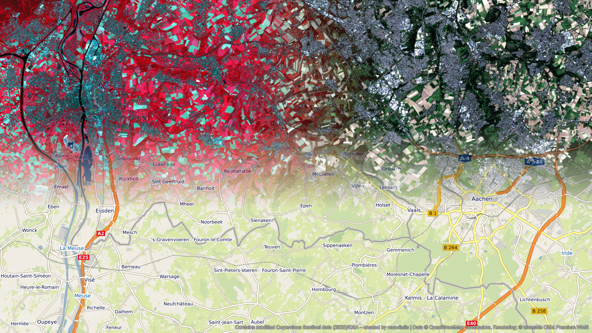 In addition to a true color composite from the red, green, and blue spectral channels, which reproduces the image in natural colors, a false color composite was also calculated. The color infrared image, which combines the near-infrared channel with the red and blue channels, is particularly well suited for detecting vegetation: this appears in various shades of red, while older vegetation is shown in green. Land areas are visible in shades of brown and green, urban areas in shades of blue to gray. Clouds, snow, and ice appear light turquoise or white. For illustration purposes, both composites were superimposed on each other in a gradient: the true-color composite can be seen in the right section of the image, while the false-color composite is shown on the left.