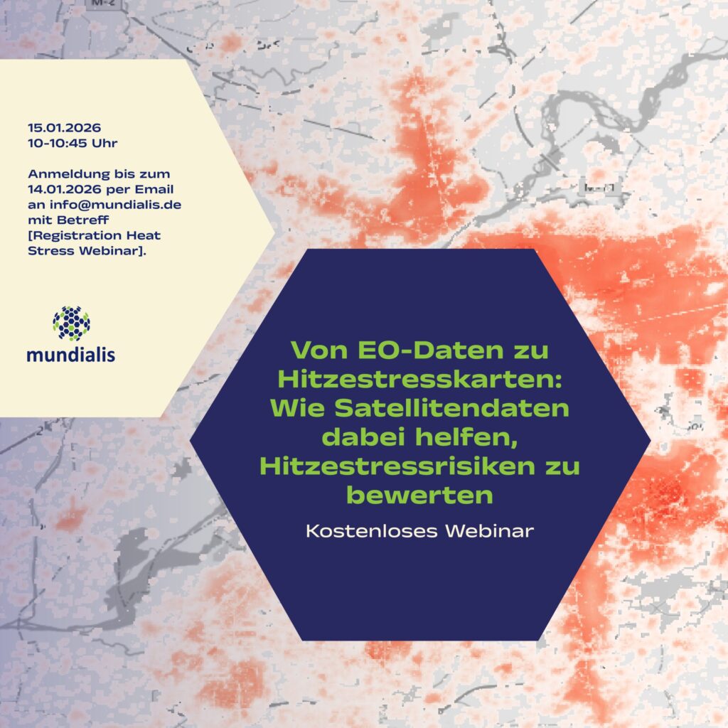 Die Teilnahme ist kostenlos und findet am 15.01.2026 von 10:00-10:45 Uhr online statt. Anmeldung bis zum 14.01.2026 per Email an info@mundialis.de mit Betreff [Registration Heat Stress Webinar]. Der Zugangslink wird nach erfolgter Anmeldung mitgeteilt.