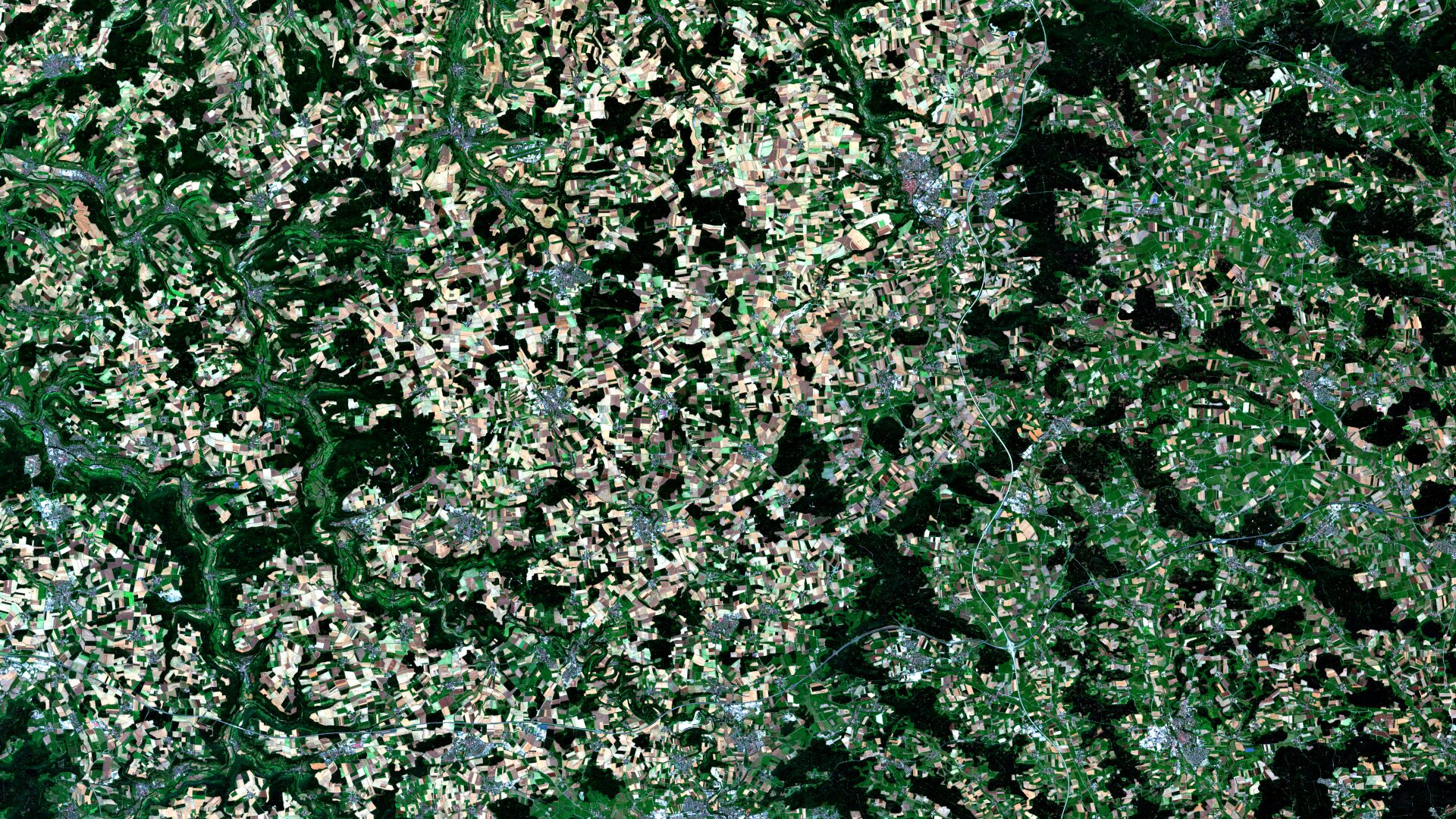 Das Bild zeigt einen Ausschnitt aus der Region Franken in Mitteldeutschland, an der nördlichen Grenze Baden-Württembergs zu Bayern. Die Datengrundlage für die zwei Bilder stellen die Satelliten Sentinel-2A und -2B. Die Darstellung erfolgt in Echtfarben auf Basis der Bänder 4 (Rot), 3 (Grün) und 2 (Blau). Detaillierte Informationen zur Bildaufbereitung und zum Sentinel-2-Datensatz finden sich hier.