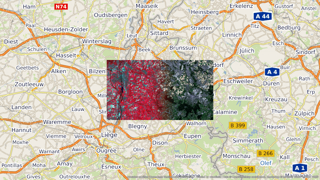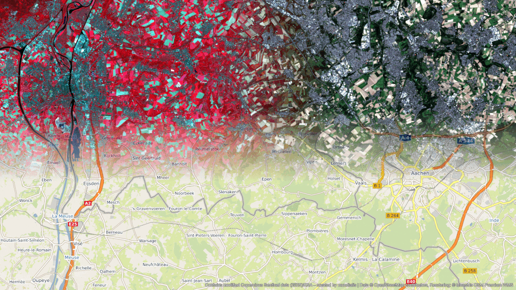 Zur Veranschaulichung wurden beide Komposite in einem Verlauf miteinander überlagert: Im rechten Bildausschnitt ist das Echtfarbenkomposit zu sehen, während im linken das Falschfarbenkomposit dargestellt wird.