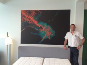 Natürlich haben das Thema Fernerkundung und Bett nichts miteinander zu tun. Im Auping Plaza gab es in der Vergangenheit schon verschiedene Lesungen und so war Geschäftsführer Markus Labinski auch offen für das artfremde Thema des Vortrags „Was hat Fernerkundung mit Kunst zu tun?“. Sowohl mundialis als auch Auping Plaza bemühen sich hiermit die ausgetretenen Pfade zu verlassen und neue Wege für sich zu ergründen.